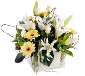 This all white bouquet of lilies and daisies is arranged and delivered in a floral gift box.
